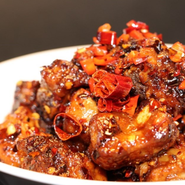 Ingredients: Pork ribs, Veg oil, Salt, Onion, Dry Chili, Garlic, Szechuan Pepper, Sugar, MSG, SOY SAUCE( water, SOYBEAN, WHEAT flour), Chicken Bouilon ( MILK, EGG), SESAME